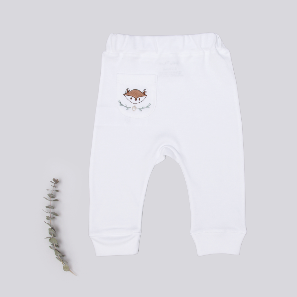 Los detalles hacen la diferencia. Pantalón con bolsillo y bordado de colección. En 100% algodón pima, disponible en tallas desde 0-3 a 9-12 meses.